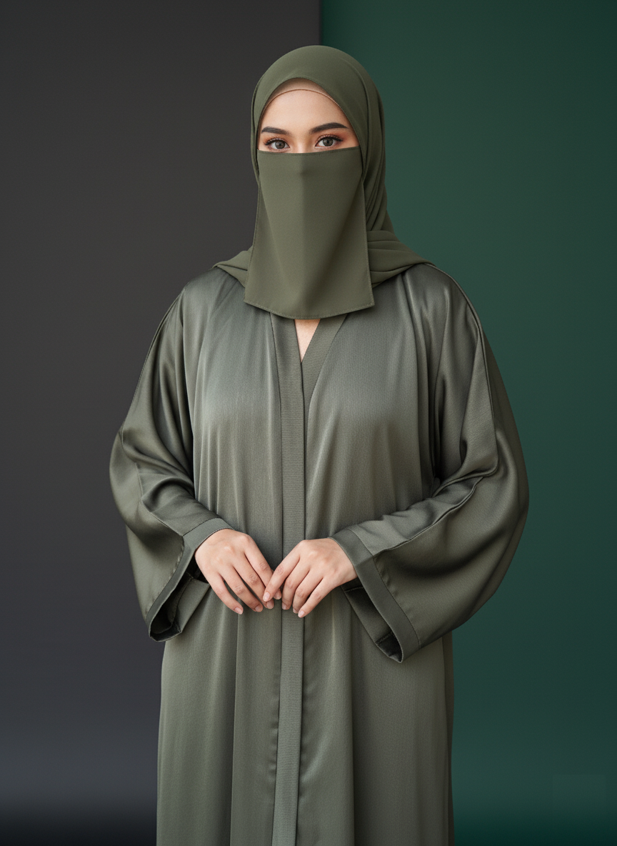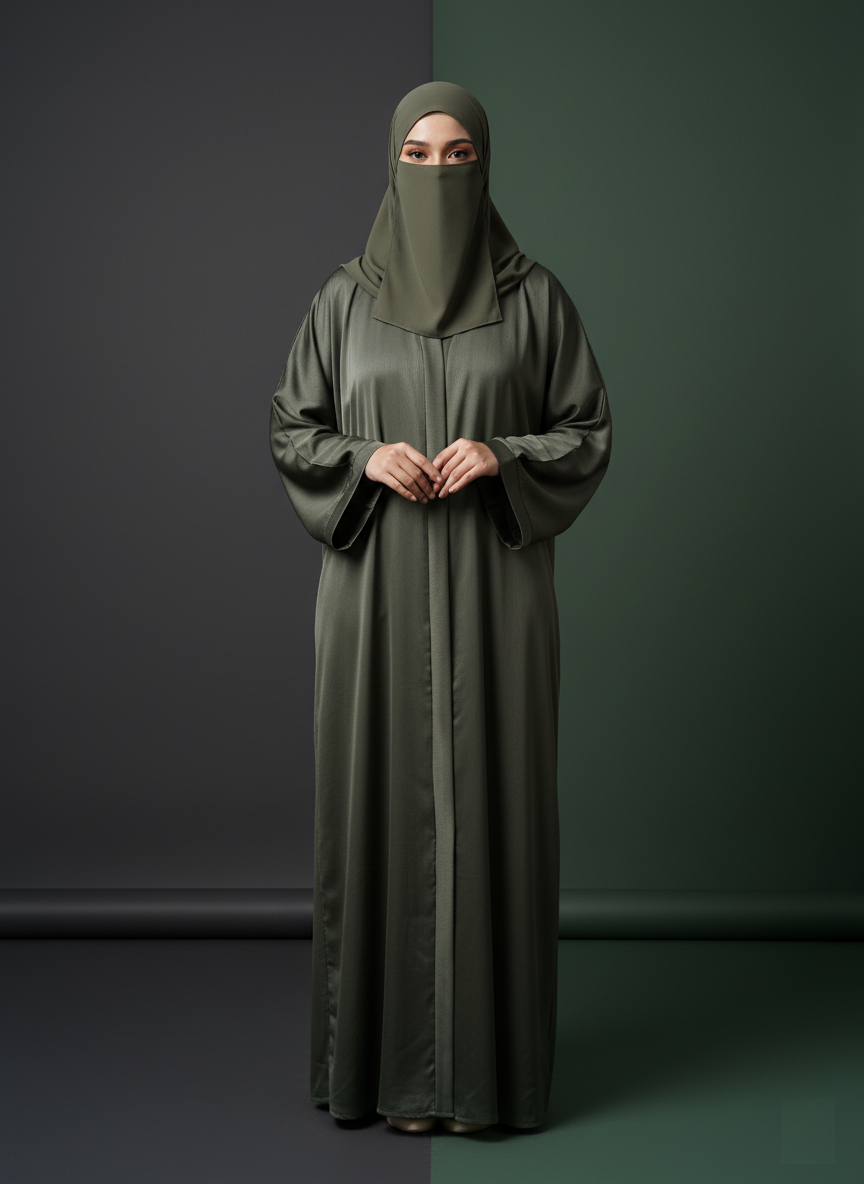 Embrace modest elegance with our Al-Zahra Abaya, a timeless piece crafted from luxurious satin. Its rich olive hue and flowing silhouette offer graceful coverage and a sophisticated look for any occasion.