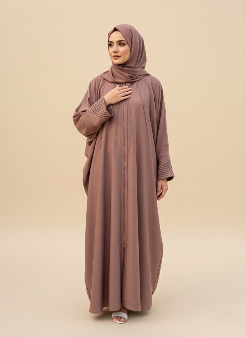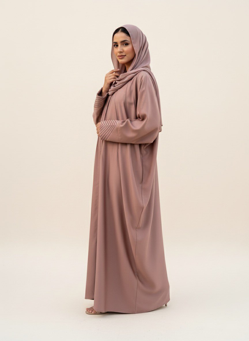 This abaya is a graceful and stylish bisht-style design in a soft mauve color. It features elegant embellishments on the cuffs, arranged in delicate chevron patterns made of fine beads or rhinestones, adding a subtle sparkle. The fabric appears smooth and flowy, draping beautifully for a refined silhouette. Paired with a matching hijab, this abaya combines modesty with sophistication, making it perfect for formal gatherings or special occasions.