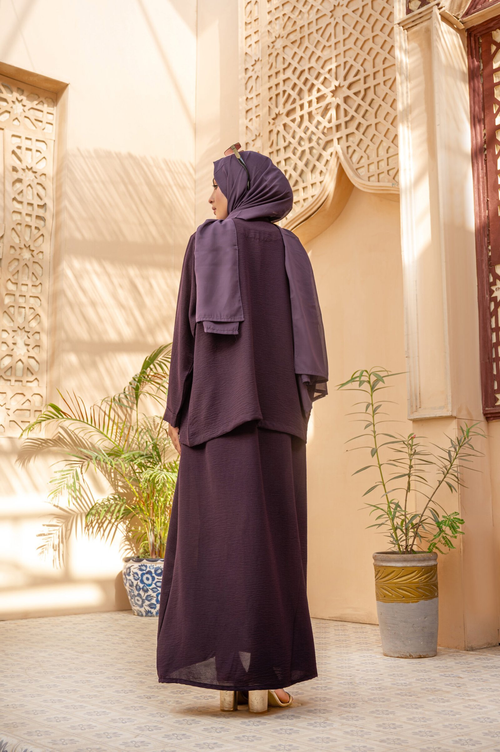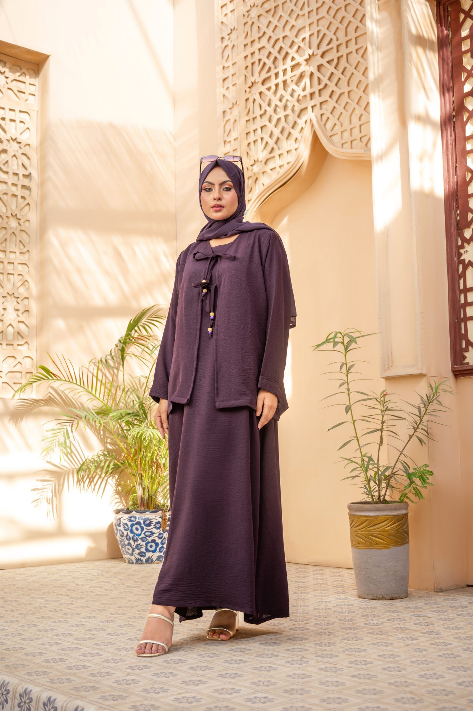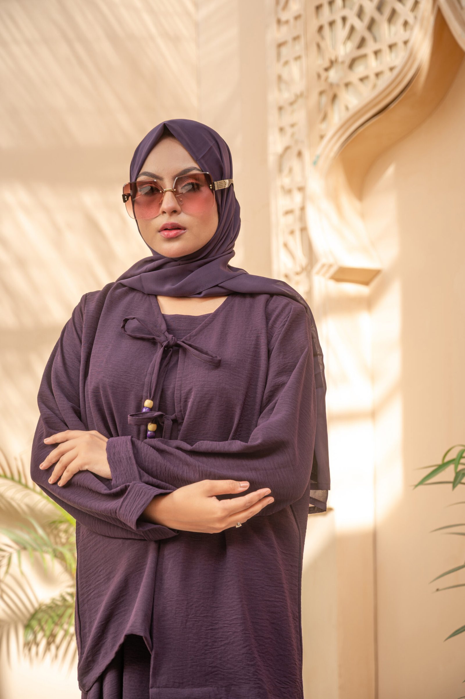 This graceful modest wear outfit is tailored from high-quality CEY fabric, known for its lightweight, breathable, and wrinkle-resistant properties, making it ideal for all-day comfort. The attire comes in a rich purple shade, symbolizing elegance and sophistication, while offering a modern twist to traditional modest fashion. The design features a flowy silhouette with a relaxed fit, complemented by a front tie detail that adds subtle charm. Paired with a matching purple scarf, it enhances the overall coordinated look. Perfect for casual gatherings or semi-formal occasions, this CEY purple modest wear combines comfort, style, and modesty effortlessly for the modern woman.