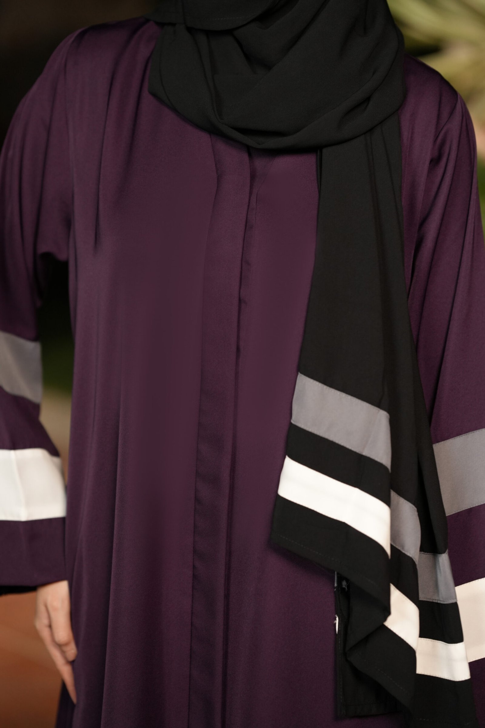 A stylish abaya in Purple plum with wide gray and white horizontal stripes. The flowing design features long flared sleeves and a front-open cut with a black scarf, it creates a modern, elegant modest look.